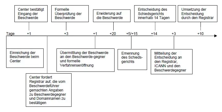 Im Vergleich zu Klageverfahren vor den ordentlichen Gerichten in Deutschland ist das UDRP-Verfahren ein Eilverfahren, das regelmäßig in weniger als zwei Monaten abgeschlossen ist. Der Verfahrensablauf stellt sich wie folgt dar: